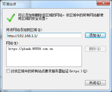 点击“站点”按钮,打开可信站点管理对话框,将服务器站点添加到可信站点列表中,如图12所示: