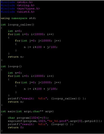 1 #include2 #include 3 #include 4 #include 5 #include 6 7 //SIGUSR1: start profiling 8 //SIGUSR2: stop profiling 9 10 static void gprof_callback(int signum) 11 { 12 if (signum == SIGUSR1) 13 { 14 printf("Catch the signal ProfilerStart\n"); 15 ProfilerStart("bs.prof"); 16 } 17 else if (signum == SIGUSR2) 18 { 19 printf("Catch the signal ProfilerStop\n"); 20 ProfilerStop(); 21 } 22 } 23 24 static void setup_signal() 25 { 26 struct sigaction profstat; 27 profstat.sa_handler = gprof_callback; 28 profstat.sa_flags = 0; 29 sigemptyset(&profstat.sa_mask); 30 sigaddset(&profstat.sa_mask, SIGUSR1); 31 sigaddset(&profstat.sa_mask, SIGUSR2); 32 33 if ( sigaction(SIGUSR1, &profstat,NULL) < 0 ) 34 { 35 fprintf(stderr, "Fail to connect signal SIGUSR1 with start profiling"); 36 } 37 if ( sigaction(SIGUSR2, &profstat,NULL) < 0 ) 38 { 39 fprintf(stderr, "Fail to connect signal SIGUSR2 with stop profiling"); 40 } 41 } 42 43 int loopop_callee() 44 { 45 int n=0; 46 for(int i=0; i<10000; i++) 47 { 48 for(int j=0; j<10000; j++) 49 { 50 n |= i%100 + j/100; 51 } 52 } 53 return n; 54 } 55 56 int loopop() 57 { 58 int n=0; 59 while(1) 60 { 61 for(int i=0; i<10000; i++) 62 { 63 for(int j=0; j<10000; j++) 64 { 65 n |= i%100 + j/100; 66 } 67 } 68 printf("result: %d\n", (loopop_callee)() ); 69 } 70 return n; 71 } 72 73 int main(int argc,char** argv) 74 { 75 char program[1024]={0}; 76 //snprintf(program,1023,"%s_%d.prof",argv[0],getpid()); 77 setup_signal(); 78 printf("result: %d\n", (loopop)() ); 79 return 0; 80 }