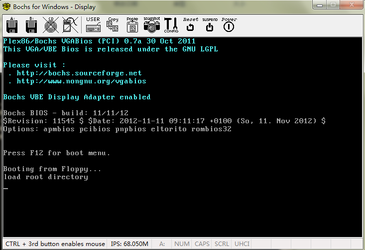 可以看出引导代码的输出语句”load root directory“,表明运行成功!!!