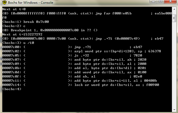 此时是暂停在BIOS中。而我们的代码是从0x7C00位置开始的,所以先要在那里设一个断点,然后继续运行到断点: