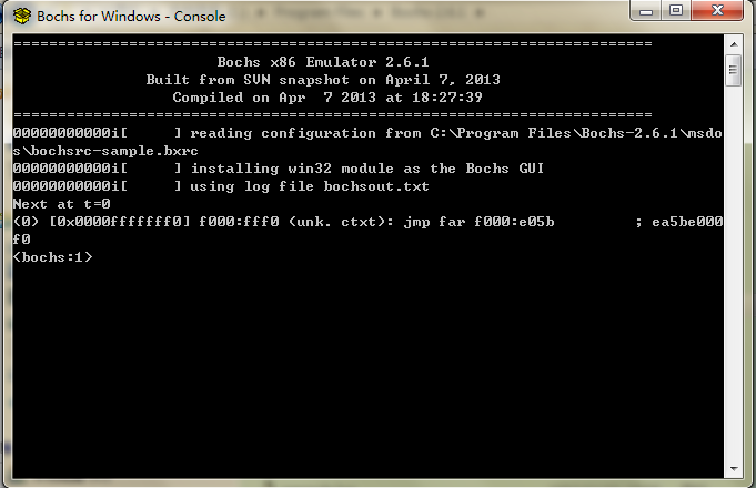 直接在bochs的安装目录中双击bochsdbg文件,然后选择加装前面我们的配置文件bochsrc-sample.bxrc,点开始就进入调试模式了,如下图所示: