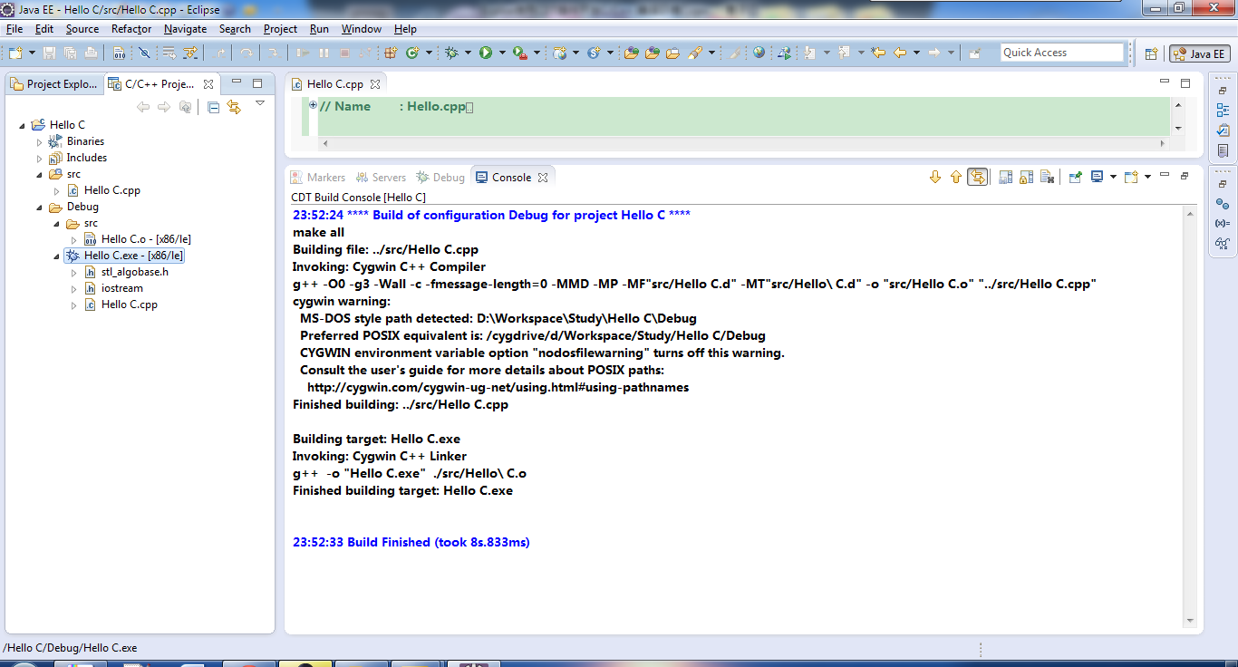 到此我们就完成了Ecplise + CDT + Cygwin开发环境的配置,以后你就可以享用其方便的功能了。