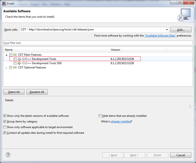 添加地址:http://download.eclipse.org/tools/cdt/releases/juno