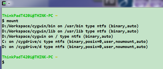依然是上面映射的问题,打开Cygwin自带的“Cygwin Terminal”,然后输入以下命令“mount”如图所示: