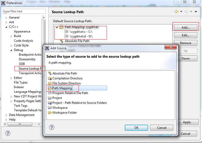 eclipse中调试时,由于GDB使用的unix格式的路径,而eclipse使用的是windows路径,导致找不到匹配的代码, 把linux的路径映射windows的路径:比如 /cygwin/c 映射成 C:\ 。
