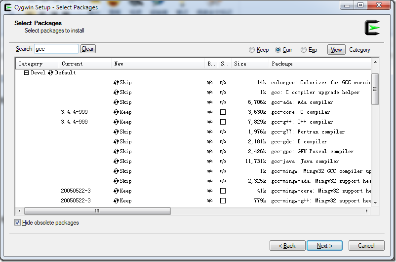 在上图的search框中输入gcc,程序会自动进行搜索,如下图,通过选择“Devel”分支下的包,找到安装我们需要的包,然后点击Skip来选择最新的安装包
