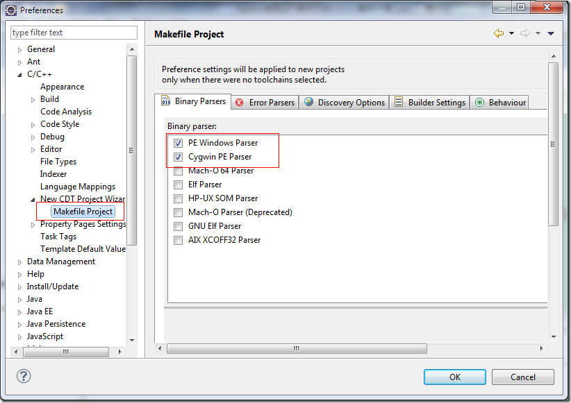 (2)配置C/C++的"Makefile Project",选择“PE Windows Parser", 和”Cygwin PE Parser" 两项。