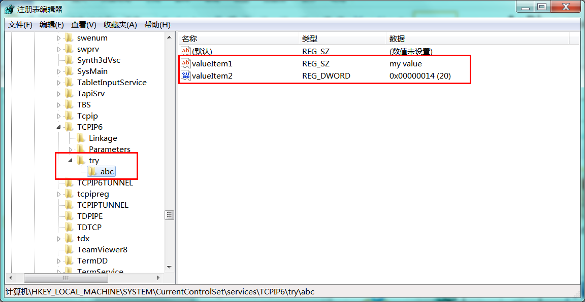 [HKEY_LOCAL_MACHINE\SYSTEM\CurrentControlSet\services\TCPIP6\try\abc]