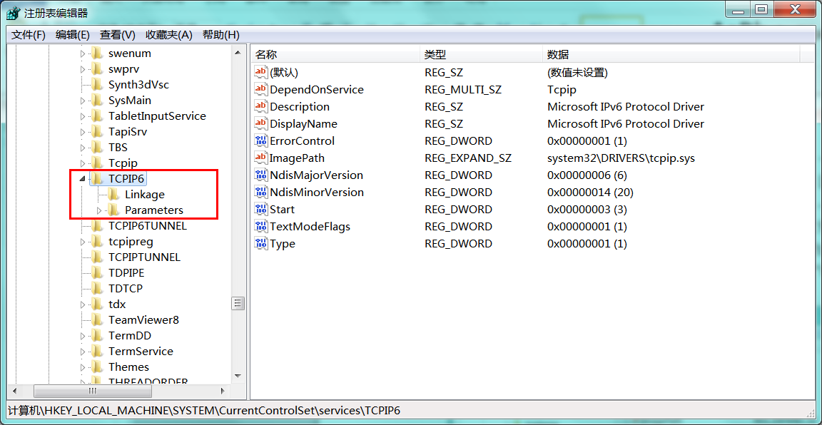 左侧展开的层次结构就是键路径,可以理解为目录,一个键就是分支中的一个目录,而子键就是这个目录中的子目录。子键同样是一个键,因为子目录下还可以有子目录。下图中的“TCPIP6”和“Linkage”就是键(子键)。
