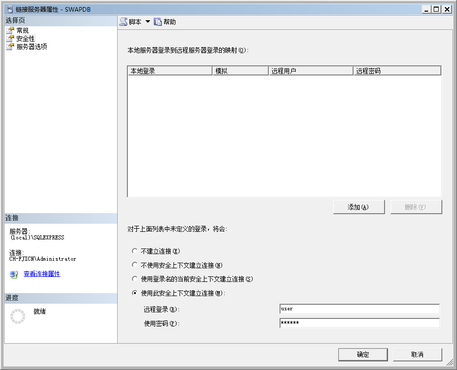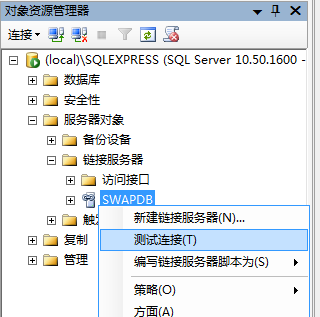 建立链接服务器后可以通过“服务器对象”-“链接服务器”-“SWAPDB”,右键“测试连接”查看是否成功。