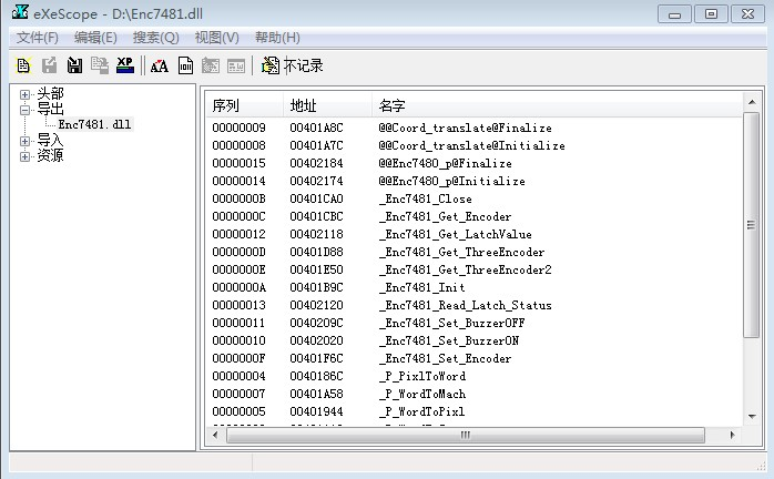 使用以上的程序后,参考厂商所给的C++程序却报找不到对应的入口点,也就是函数名称不对。C++DLL编译后函数名称会有变化,需使用eXeScope.exe查询具体的函数名称。