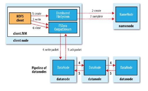 当客户端开始写入文件的时候,开发库会将文件切分成多个packets,并在内部以"data queue"的形式管理这些packets,并向Namenode申请新的blocks,获取用来存储replicas的合适的datanodes列表, 列表的大小根据在Namenode中对replication的设置而定。开始以pipeline(管道)的形式将packet写入所有的replicas中。开发库把packet以流的方式写入第一个 datanode,该datanode把该packet存储之后,再将其传递给在此pipeline中的下一个datanode,直到最后一个 datanode,这种写数据的方式呈流水线的形式。