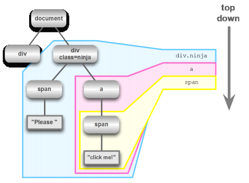 表达式中的第一项,div.ninja 指明了文档中的一颗子树。在那颗子树中,接着找表达式中下一项对应的子树。最后,span的目标节点被找到。