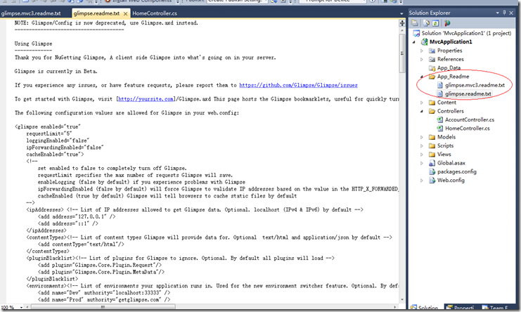安装完成后,也会一并安装Glimpse for ASP.NET Beta(),安装完成之后会在方案中新建一个文件夹“App_Readme”,里面有两个Readme文件,其中“glimpse.readme.txt” 的档案内容里有详细说明,说明如何修改Web.Config以及功能介绍