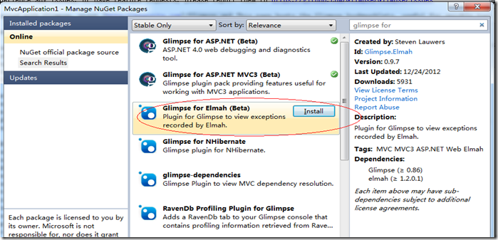 接下来介绍如何透过NuGet安装Elmah plugin for Glimpse以及部分的修改设定。