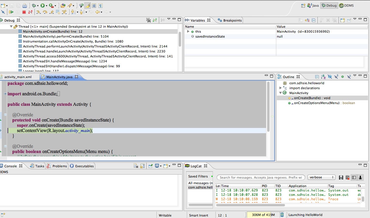 2、然后在onCreate或其他地方设置断点,进入调试界面后如下: