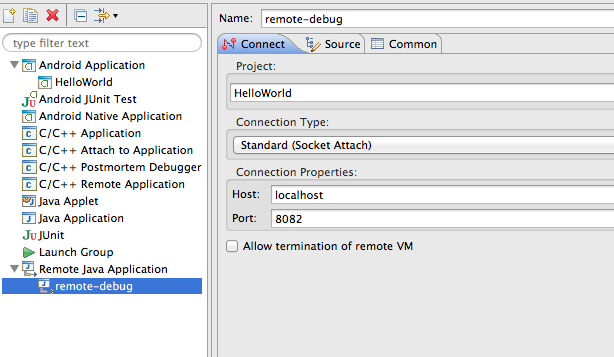 2、创建andoird项目(可以是hello world),选择android项目右键debug as-debug Configurations,然后选择左下角家remote java application右键new,设置,效果: