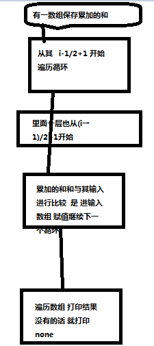 输出数据:在标准输出上打印出符合题目描述的全部正整数序列,每行一个序列,每个序列都从该序列的最小正整数开始、以从小到大的顺序打印。如果结果有多个序列,按各序列的最小正整数的大小从小到大打印各序列。此外,序列不允许重复,序列内的整数用一个空格分隔。如果没有符合要求的序列,输出“NONE”。