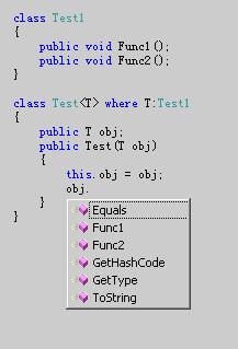 3、“显式约束”并非必须,如果没有指定“显式约束”,范型类型参数将只能访问System.Object类型中的公有方法。例如:在开始的例子中,定义的那个obj成员变量。比如我们在开始的那个例子中加入一个Test1类,在它当中定义两个公共方法Func1、Func2,如下图: