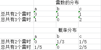 上表说明当雷数为2时,abc有雷的概率分别为0,1/3,1/5;当雷数为3时,abc有雷的概率分别为1/5,0,2/5。