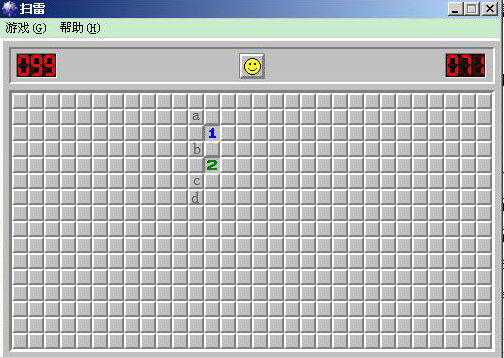 可知,a区域有雷的概率最小,故可以在此5块中随机选一块点击了,然后一切就交给上苍了~~(在不用类似查看内存的方法的情况下,人做的就只有这么多了)