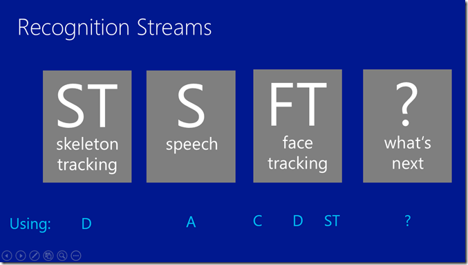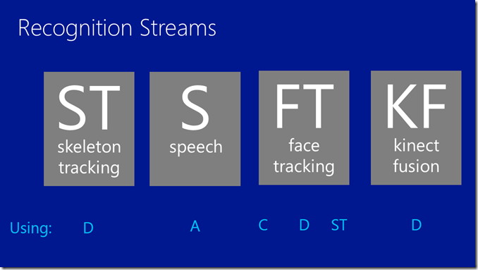 第二类数据源是,SDK中通过一些算法识别出来的可以直接拿来进行识别的数据源,他们包括:骨骼追踪,语音识别,面部识别数据源。