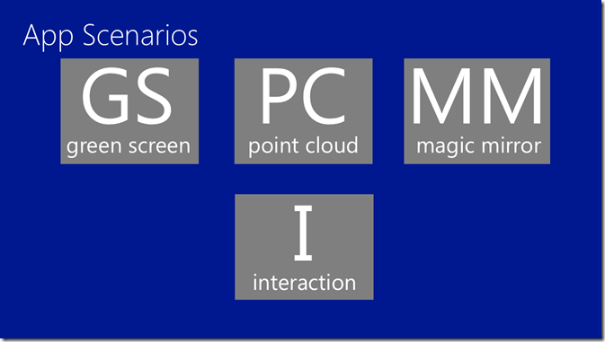 第三个应用是魔镜功能,我觉得应该是一些类似哈哈镜效果或者是IOS中的Photo Booth应用,主要用到了彩色影像数据,面部识别,骨骼识别等功能。还有一些就是虚拟试衣间这样的功能,最后的一个应用场景就是各种NUI交互界面了。