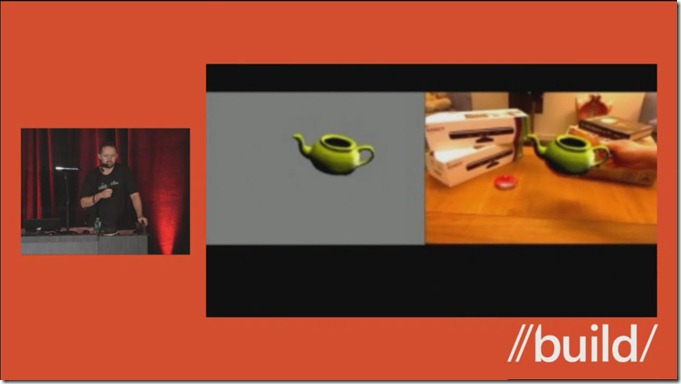 下面是演示的例子:图中,右边桌子上摆放了一个茶壶,然后利用Kinect对该茶壶进行了三维建模,然后。移除右边实物茶壶后,用户可以对虚拟的茶壶进行各种操作,神奇吧,这些都是下一个版本或者是将来的SDK能够方便我们或者简化我们实现这些功能准备添加的功能。