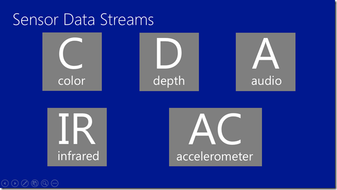 大会上关于Kinect开发有三个,第一个是微软研究院讲的Super-Natural Interaction这个屁屁踢比演讲视频都大,达到了罕见的997M,为啥这么大呢,因为里面嵌入了一个长达40分钟视频,哈哈,这个演讲主要演示了微软研究院正在进行的各种人机交互,虚拟现实等研究,非常的Cutting-edge,里面也有和Kinect相关的部分,有兴趣的可以看看。第二个是Kinect Design Considerations,一则关于Kinect应用程序设计是应该考虑的问题比如交互方式的设计的演讲,我没有太仔细看,不过内容应该和Kinect Human Interface Guideline内容差不多,您可以在Kinect Developer Toolkit中查看。第三篇演讲是 Kinect for Windows Programming Deep Dive 我将这个翻译为了深入理解Kinect for Windows开发,相对来说该演讲和Kinect开发比较相关,现与大家分享,该演讲上面写的级别为 300-advanced,个人觉得这个演讲内容其实很简单,只是对Kinect能够获取的相关数据源,Kinect SDK处理过了的可供识别的数据源,以及未来的趋势和大家做了一下介绍。Kinect SDK中其实没有太多的东西,真正的则在于各种模式识别算法,比如通过深度数据,红外数据,进行各种物体识别等等,有了这些数据,尤其是1.6版本的SDK提供的获取红外原始数据,就可以通过这个数据,结合深度数据做出很多非常令人惊叹的应用来。废话不多说了,下面和大家分享一下该演讲的主要内容,也算是一个关于Kinect开发的比较好的入门介绍吧。