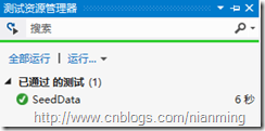1: [TestMethod]2: public void SeedData()3: {4: Database.SetInitializer(new DropCreateDatabaseWithSeedData());5: ListblogList = null; 6: using (ConnectDatabase.TestContext ctx = new ConnectDatabase.TestContext())7: {8: blogList = ctx.Blogs.OrderBy(t => t.Id).ToList();9: }10: Assert.AreEqual(2, blogList.Count);11: Assert.AreEqual("种子数据1", blogList[0].Name);12: Assert.AreEqual("种子数据2", blogList[1].Name);13: }测试结果: