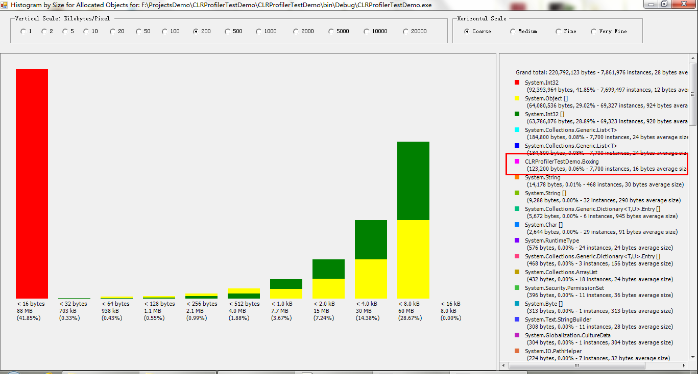 下面是一个拆箱装箱的例子CLRProfilerTestDemo,通过这个例子来观察进程托管堆的分配和研究垃圾回收机制的行为表现,代码如下: