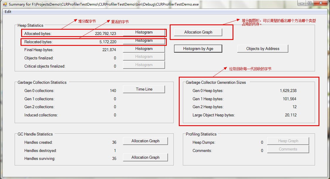 编译程序,点击Start Application选择CLRProfilerTestDemo.exe,将会运行此程序,运行一段时间后,点击Kill Application,CLRProfiler将会显示分析结果。