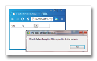 1: public partial class Default : PageBase2: {3: protected void Page_Load(object sender, EventArgs e)4: {5: if (!this.IsPostBack)6: {7: string op1 = Request.QueryString["op1"];8: string op2 = Request.QueryString["op2"];9: if (!string.IsNullOrEmpty(op1) && !string.IsNullOrEmpty(op2))10: {11: this.txtResult.Text = (int.Parse(op1) / int.Parse(op2)).ToString();12: }13: }14: }15:16: protected void btnCal_Click(object sender, EventArgs e)17: {18: int op1 = int.Parse(this.txtOp1.Text);19: int op2 = int.Parse(this.txtOp2.Text);20: this.txtResult.Text = (op1 / op2).ToString();21: }22: }现在运行我们程序,可以想象如果在表示操作数的文本框中输入一个非整数字符,调用Int32的Parse方法时将会抛出一个FormatException异常,或者将被除数设置为0,则会抛出一个DivideByZeroException异常。如下面的代码片断所示,在这两种情况下相应的错误信息按照我们预定义的格式以Alert的形式显示出来。