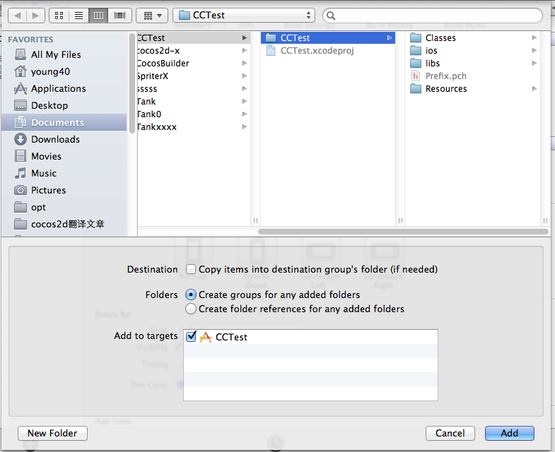 然后将目录/opt/cocos2d-2.0-x-2.0.3/CCTest/Classes添加到项目.请确保Destination是没有被选中的.这样代码将是以引用的方式存在在项目中的.