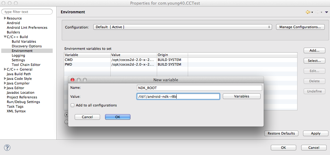 | export COCOS2DX_ROOT=/opt/cocos2d-2.0-x-2.0.3 export ANDROID_SDK_ROOT=/opt/android-sdk-macosx export ANDROID_NDK_ROOT=/opt/android-ndk-r8b export NDK_ROOT=/opt/android-ndk-r8b export PATH=$PATH:$ANDROID_NDK_ROOT export PATH=$PATH:$ANDROID_SDK_ROOT |