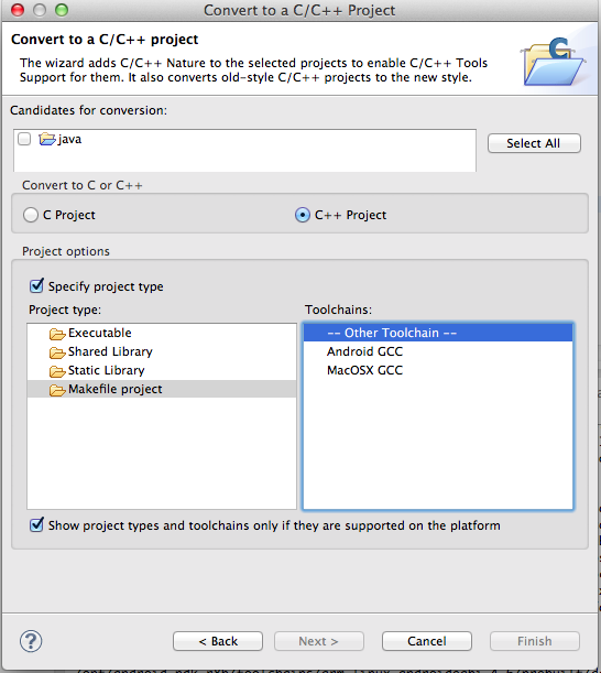 在接下来一屏中选择C++ Project以及 Project Type为Makefile project, Toolchains为Other