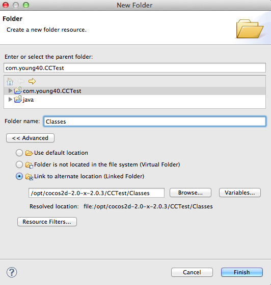 首先添加/opt/cocos2d-2.0-x-2.0.3/CCTest/Classes到项目中.如图添加一个Link类型的文件夹.
