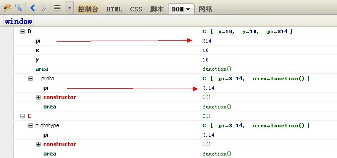 通过B.pi = 314; 设置并不会改变prototype.pi 的值