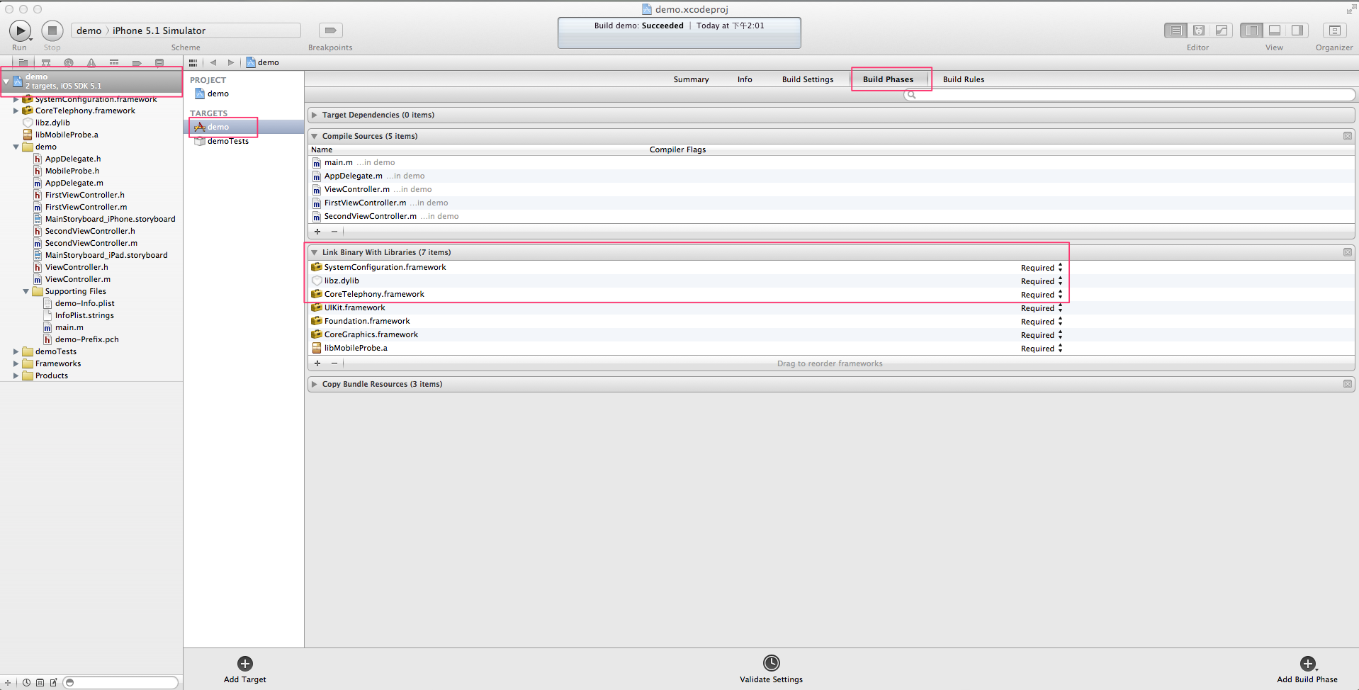 打开工程Targets的Build Phases选项,在Link Binary With Libraries添加libz.dylib,CoreTelephony.framework,SystemConfiguration.framework。如图二所示。