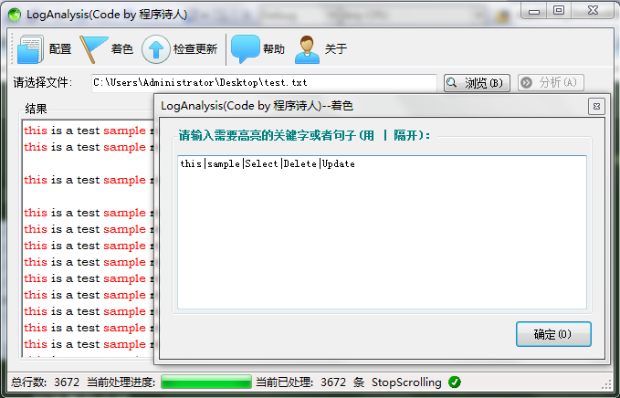 下面的这个是着色窗体,输入关键字,以数显隔开,点击确定按钮可以实时实现关键字高亮: