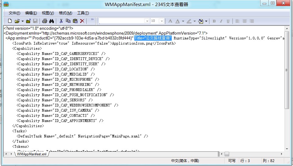 2、修改程序名:WMAppManifest.xml在记事本打开,会看到开头一段,Title="公交路线查询" 这里你可以修改任意你想要的名字,中英文都可以,但注意有些改了中文会安装错误,如图