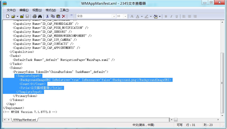 5、想在主屏显示程序的大图..而不是默认的小图的话,WMAppManifest.xml在记事本打开,会看到最后面一段有