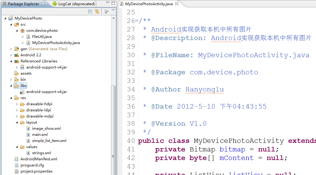 在这个示例中,我使用android-support-v4.jar中的加载器来实现获取本机中所有图片,关于这个包在以前的文章中也提到,是一个非常有用的包。