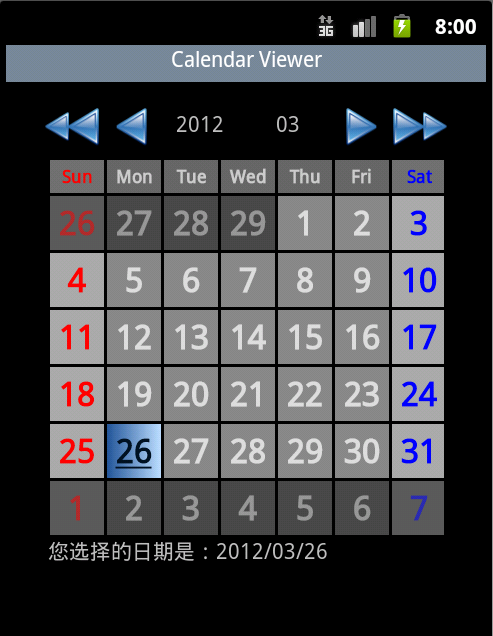 我们大家都知道,在Android平台3.0中才新增了日历视图控件,可以显示网格状的日历内容,那么对于3.0以下的版本要使用日历控件只能借助第三方,目前用的最多的是CalendarView。