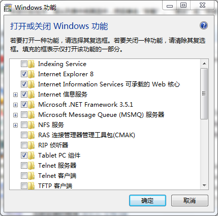 3.选中internet information services可承载的Web核心,internet信息服务,Microsoft.net framework 3.5.1,把展开列表的选中项都选中,知道都编程勾号,然后确定,安装。