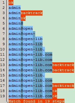 乍看这样一个解析过程没问题,逻辑正确,但其实暗藏很多问题,看看以下的一个匹配图,backtrack则表示回溯(使用RegexBuddy可以很清晰的看到这过程)