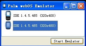 打开之后,就是出现这个窗口,现在你可以选择一个虚拟机了,这里有两种类型的分辨率:320x400及320x480的(这是webOS 1.45的,若是webOS 3.0,那就有1024x768的分辨率选项了。)