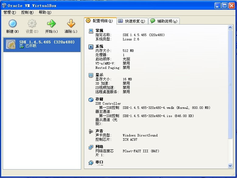 现在,在VirtualBox里面,就可以看到刚刚的那个虚拟机的项目,当然你可能建立多个项目的(同上:点击Palm Emulator快捷方式创建),删除了再建立也是没问题的。