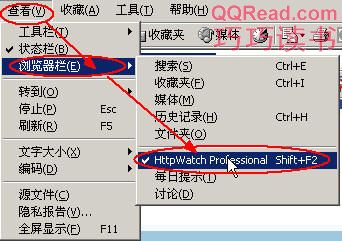 2、启动IE,从IE的“查看”—“浏览器栏”—“HttpWatch”启动HttpWatch。如下图所示: