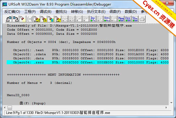 现在点击软件菜单“反汇编”→“打开文件”,然后选择《秘书智能排座》软件的“智能排座程序.exe”,经过一会的等待之后,你就会看到W32dsm为我们分析出来的汇编代码了,如下图: